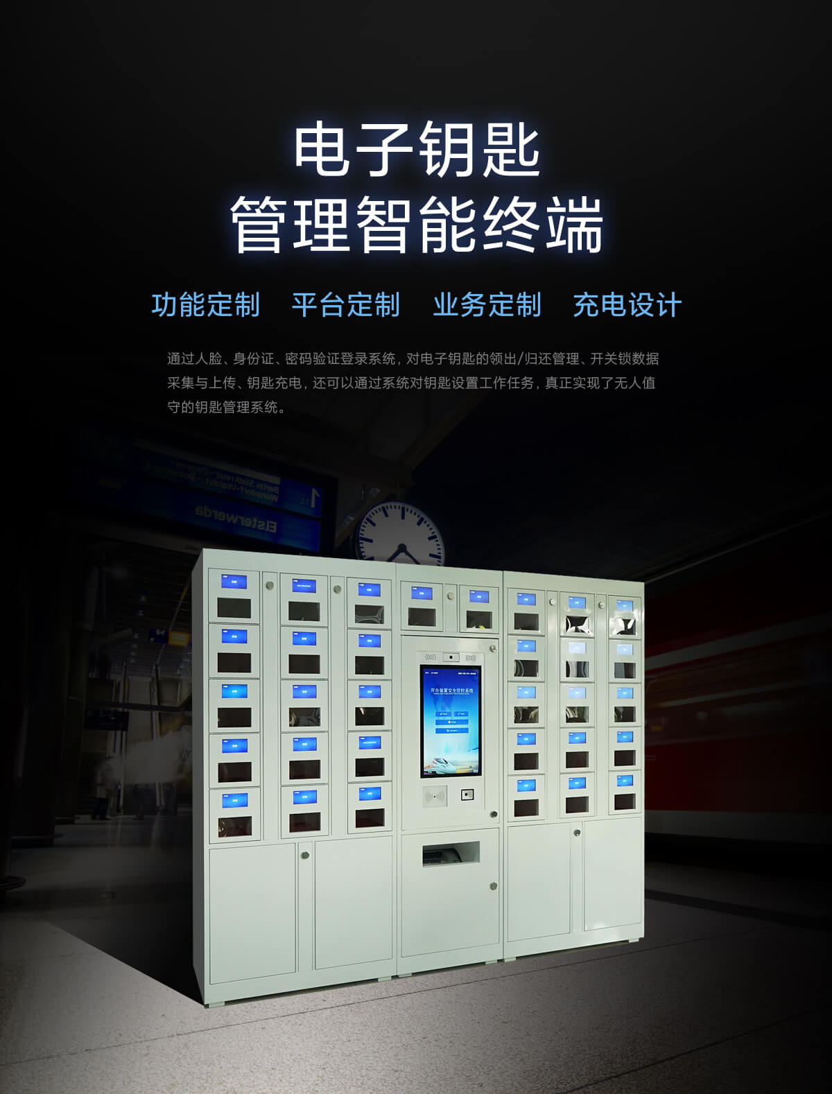 通過人臉、身份證、密碼驗證登錄系統,對電子鑰匙的領出/歸還管理、開關鎖數據采集與上傳、鑰匙充電,還可以通過系統對鑰匙設置工作任務,真正實現了無人值守的鑰匙管理系統。