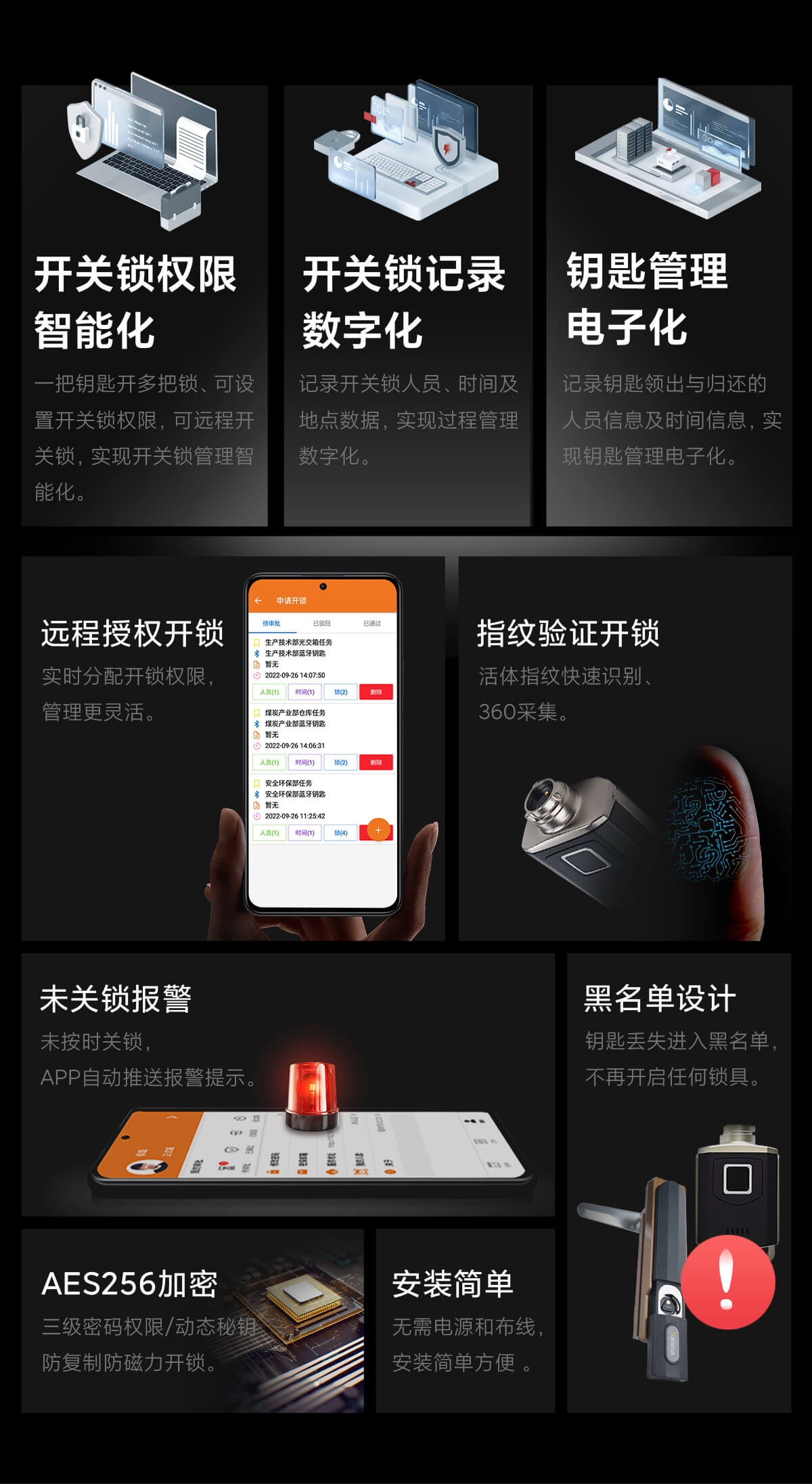 通過指紋先驗證開關鎖人員,再由手機APP遠程授權開關鎖權限,鑰匙自動記錄開關鎖數據,通過手機APP實現遠程數據上傳,系統軟件自動分析開關鎖數據。實現開關鎖數字化管理