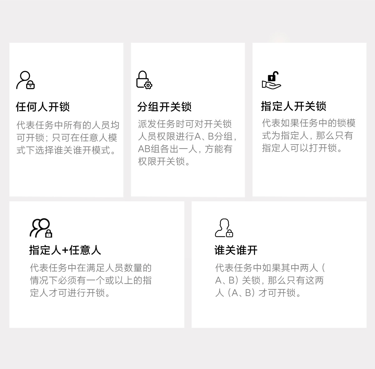 任意分配開鎖任務,可單人/多人組合驗證開關鎖。