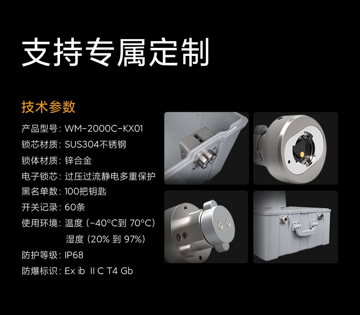 產品型號:WM-2000C-C03 鎖體材質:不銹鋼 鎖體材質:鋅合金 表面處理:不銹鋼本色拉絲 電子鎖芯:過壓過流靜電多重保護 黑名單數:100把鑰匙 開關記錄:60條 使用環境:溫度(-40°C到 70°C)濕度(20% 到 97%) 防護等級:IP68 防爆標識:Ex ib ⅡC T4 Gb 重量:96g