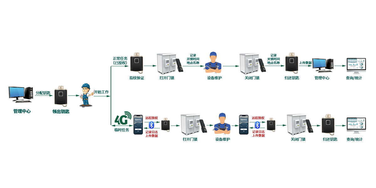 Vanma智能鎖控系統隨運維平臺,維護工單一起授權鑰匙權限,可以進行開關鎖權限管控;同時...