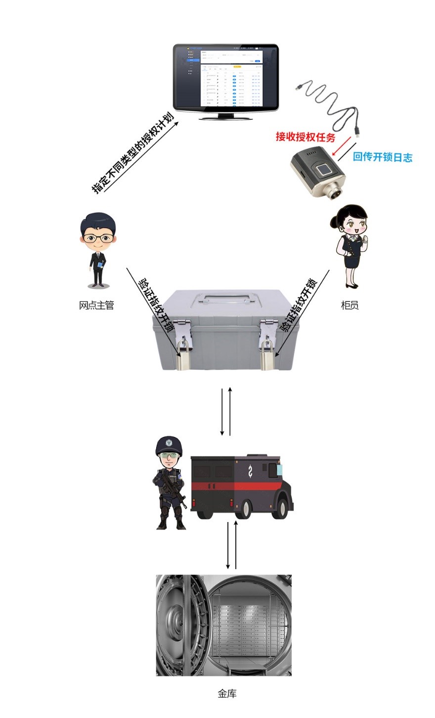 由押運公司主管(金庫主管)制定任務,指定相應押運人員以及對應網點編號。押運人員到網點后,由該網點主管登錄系統接收任務,并由相應押運人員進行身份驗證(在指紋電子鑰匙上),只有(指紋)驗證通過后,方可進行款箱交接。