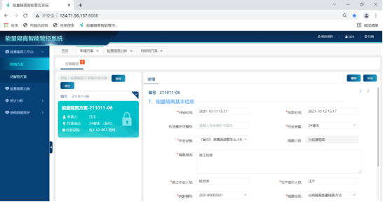PC端能量隔離智能管控平臺通過對裝置設備點位基礎信息的采集維護,可在線制定能量隔離工作方案,明確隔離鎖定點位及方式、作業人員、智能鎖定設備及權限,并對隔離鎖定過程操作進行實時監控和電子臺賬統計。