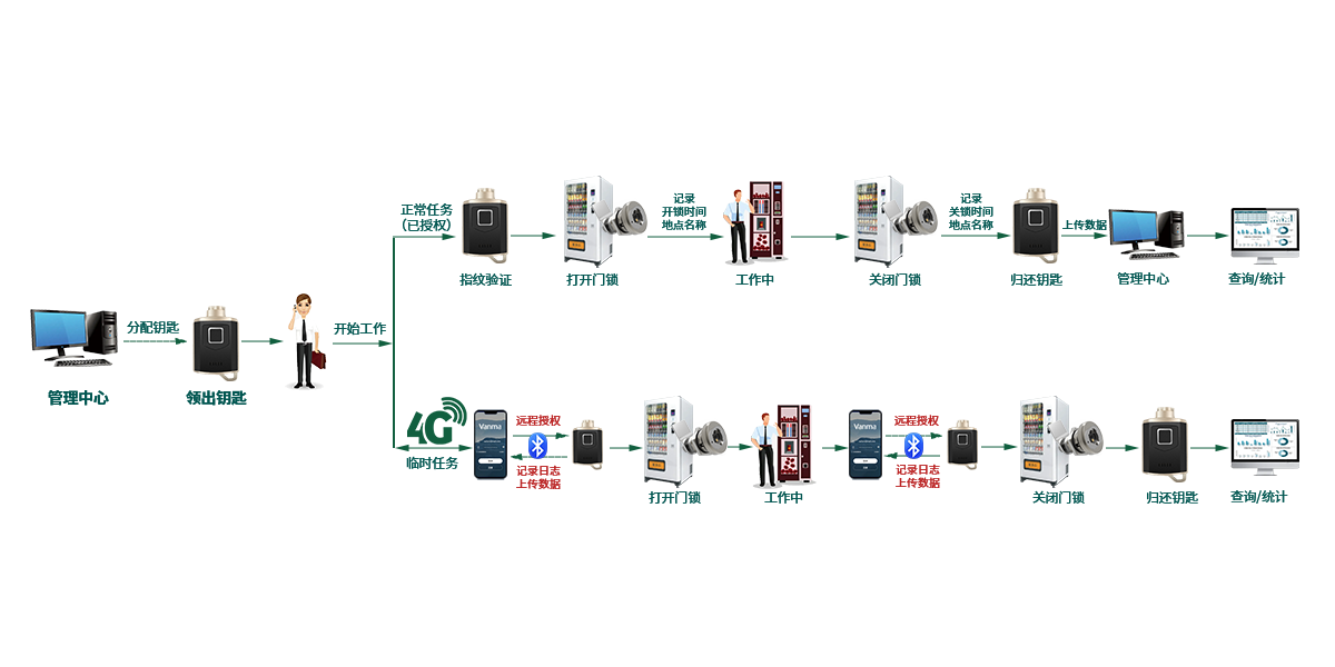 自動(dòng)售貨機(jī)鎖控管理系統(tǒng)由智能無(wú)源電子鎖、智能指紋藍(lán)牙鑰匙、手機(jī)APP、主站管理軟件四部分組成。智能無(wú)源電子鎖完成機(jī)械動(dòng)作及數(shù)據(jù)存儲(chǔ);智能指紋藍(lán)牙鑰匙實(shí)現(xiàn)人員識(shí)別、給鎖供電及數(shù)據(jù)傳輸;手機(jī)APP與智能指紋藍(lán)牙鑰匙通訊,實(shí)現(xiàn)遠(yuǎn)程授權(quán)操作及數(shù)據(jù)遠(yuǎn)程上傳。