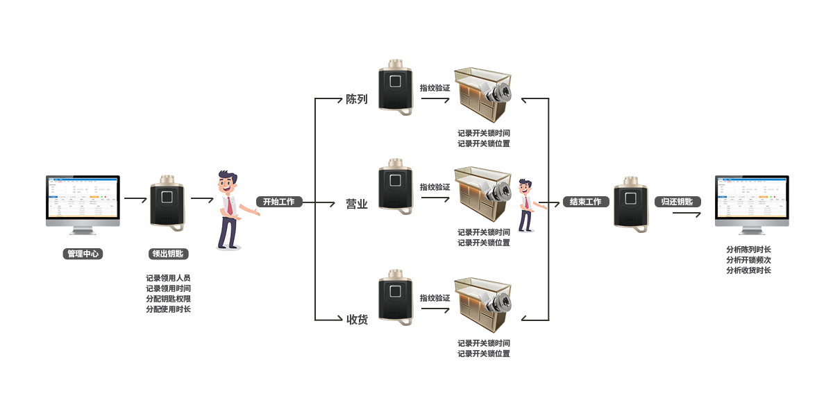 Vanma無源電子鎖改變傳統的安全管理理念,通過互聯網、大數據、數字化技術的結合,把人員信息、電子防盜鎖具、智能鑰匙、時間記錄對應到珠寶店內的人、貨、場,形成一個可追溯的數據化閉環管理。